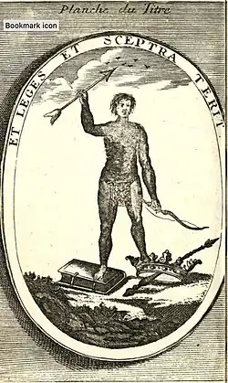 Planche de titre des Nouveaux Voyages. Un autochtone foule aux pieds codes de lois et sceptres, surmonté d'une inscription latine (Et leges et sceptra terit « Il foule aux pieds les lois et les sceptres »)
