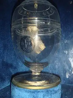 - ↑ Le reliquaire est décrit comme « un vase en cristal, de forme ovoïde, aminci à l'extrémité inférieure, avec un large pied rond, cerclé d'une bordure de cuivre doré arrondie, s'ouvrant par le milieu, et contenant extérieurement, à sa partie supérieure servant de couvercle, dix-sept étoiles taillées dans le cristal, entre deux rainures circulaires également taillées, avec un trou de deux millimètres à l'extrémité supérieure, dans lequel est posée extérieurement une fleur de lys de deux centimètres de haut en cuivre doré. Ce vase contient un cœur desséché, tenant à la paroi supérieure dudit vase par un petit cylindre de cuivre ». Source : Philippe Delorme, Louis XVII, la vérité. Sa mort au Temple confirmée par la science, Pygmalion, , p. 184.
