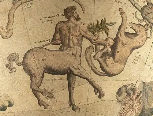 Les figures de Centaurus et Lupus sur un des globes célestes de Mercator, 1551.