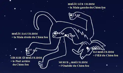C’est en ce temps-là que le ciel est contexturé en constellations, c’est-à-dire que les étoiles nouvellement désignées, le sont par un nom exprimant leur place dans la figure qui doit son nom à l’étoile initiale. De la sorte, la constellation Ainsi, la figure d’UR.IDIM a pris corps et nous trouvons, si nous joignons deux documents : le Catalogue de Dalbanna[3], et La table des cordons[4], les étoiles suivantes lui appartenant : IGI, « l’Œil » (γ Lup), GÌR IGIR, « le Pied arrière » (ζ Sco), MURUB4, « l’Ombilic » (η Lup), ŠU ZAG, « la Main droite » (θ Lup), ŠU GÙB, « le Main gauche » (χ Lup).