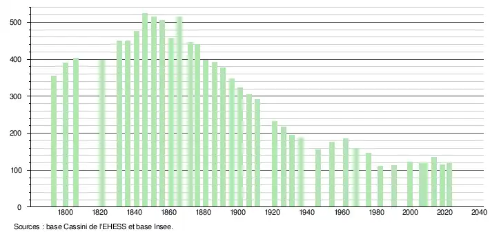 L'évolution du nombre d'habitants est connue à travers les recensements de la population effectués dans la commune depuis 1793. Pour les communes de moins de 10 000 habitants, une enquête de recensement portant sur toute la population est réalisée tous les cinq ans, les populations de référence des années intermédiaires étant quant à elles estimées par interpolation ou extrapolation[24]. Pour la commune, le premier recensement exhaustif entrant dans le cadre du nouveau dispositif a été réalisé en 2008[25].
