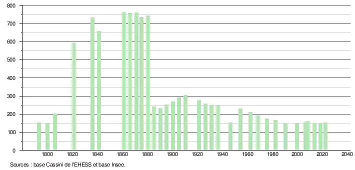 L'évolution du nombre d'habitants est connue à travers les recensements de la population effectués dans la commune depuis 1793. Pour les communes de moins de 10 000 habitants, une enquête de recensement portant sur toute la population est réalisée tous les cinq ans, les populations de référence des années intermédiaires étant quant à elles estimées par interpolation ou extrapolation[23]. Pour la commune, le premier recensement exhaustif entrant dans le cadre du nouveau dispositif a été réalisé en 2008[24].
