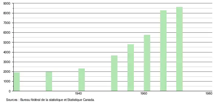 - ↑ Bureau fédéral de la statistique, recensements du Canada pour les années 1921, 1931, 1941, 1951, 1956, 1961 et 1966.