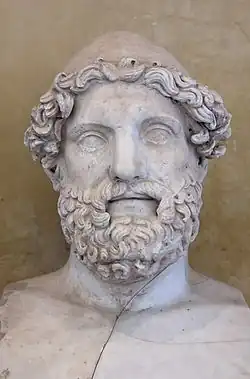 - ↑ Texte original : « esparcida sobre el pecho la hermosa barba con mechones de canas. Su cabeza rizada y ciega, de un gran carácter clásico-arcaico, recuerda los Hermes »