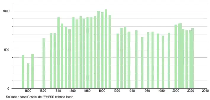 L'évolution du nombre d'habitants est connue à travers les recensements de la population effectués dans la commune depuis 1793. Pour les communes de moins de 10 000 habitants, une enquête de recensement portant sur toute la population est réalisée tous les cinq ans, les populations de référence des années intermédiaires étant quant à elles estimées par interpolation ou extrapolation[40]. Pour la commune, le premier recensement exhaustif entrant dans le cadre du nouveau dispositif a été réalisé en 2004[41].
