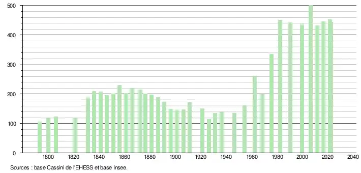 L'évolution du nombre d'habitants est connue à travers les recensements de la population effectués dans la commune depuis 1793. Pour les communes de moins de 10 000 habitants, une enquête de recensement portant sur toute la population est réalisée tous les cinq ans, les populations de référence des années intermédiaires étant quant à elles estimées par interpolation ou extrapolation[30]. Pour la commune, le premier recensement exhaustif entrant dans le cadre du nouveau dispositif a été réalisé en 2006[31].