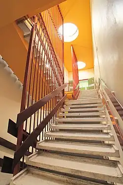La circulation extérieure et intérieure est également étudiée pour permettre une grande fluidité, et offrir un passage protégé en cas d’intempéries. Les coursives du patio sont relayées par des portiques ; l’un mène au réfectoire, les autres permettent de passer du bâtiment principal vers l’atelier, puis de l’atelier vers l’infirmerie. L’étage des salles banalisées des ateliers est construit en débordement, et offre là encore un passage extérieur couvert. A l’intérieur du bâtiment principal s’élève deux doubles cages d’escaliers symétriques, en pierre et en forme d’échelle de perroquet[4]. Elles permettent au flux des élèves de se répartir facilement dans les couloirs pour arriver au plus près de leur salle.