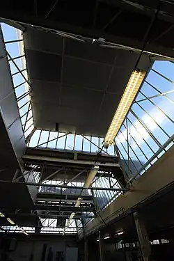 - la surface de l’atelier est agrandie et on lui ajoute l’équivalent de deux sheds. La différence entre les sheds première phase et deuxième phase est visible même dans leur structure : les plus anciens se composent d’une verrière de carreaux maintenus par une structure métallique d’orientation verticale, la deuxième est renforcée par une structure métallique en forme de croix. C’est dans cette extension que sont placés les ateliers mécanique automobile et le magasin du lycée. L’espace central de l’atelier reste ouvert, sans cloisons jusqu’aux années 2000. Sur la façade ouest des ateliers, deux autres salles sont adjointes. Très vastes afin d’accueillir les machines nécessaires aux élèves, elles sont éclairées par des lanterneaux carrés (photo)