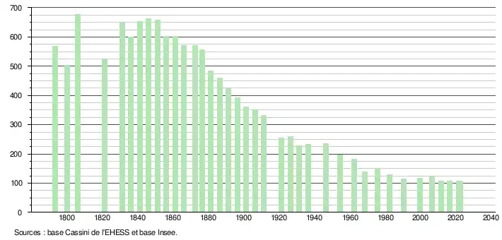 L'évolution du nombre d'habitants est connue à travers les recensements de la population effectués dans la commune depuis 1793. Pour les communes de moins de 10 000 habitants, une enquête de recensement portant sur toute la population est réalisée tous les cinq ans, les populations de référence des années intermédiaires étant quant à elles estimées par interpolation ou extrapolation[13]. Pour la commune, le premier recensement exhaustif entrant dans le cadre du nouveau dispositif a été réalisé en 2006[14].