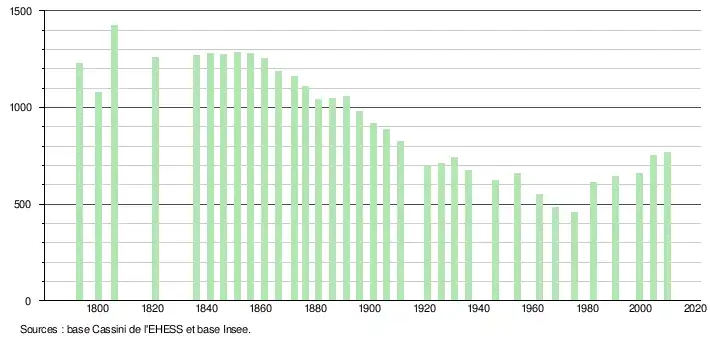 - ↑ Dans le tableau des recensements et le graphique, par convention dans Wikipédia, le principe a été retenu, pour les populations légales postérieures à 1999 de n’afficher dans le tableau des recensements et le graphique que les populations correspondant à l'année 2006, première population légale publiée calculée conformément aux concepts définis dans le décret no 2003-485 du 5 juin 2003, et les années correspondant à une enquête exhaustive de recensement pour les communes de moins de 10 000 habitants, ainsi que la dernière population légale publiée par l’Insee.