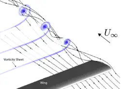 - instabilité de cisaillement bidimensionnelle pour des profils de vitesse perpendiculaire à l'écoulement ayant un point d'inflexion (instabilité de Kelvin-Helmholtz). Le tourbillon généré est dans le plan de l'écoulement ;