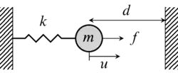 Dans cette section, afin d'établir un cadre (très) simplifié de la mécanique du contact, un seul degré de liberté est supposé, comme indiqué sur la figure 1 : le système idéalisé implique donc le déplacement de la masse . Cette masse est initialement, c'est-à-dire quand le système est au repos (force extérieure ignorée ), séparée d'un mur rigide d'une distance appelée jeu. Sous l'effet d'un force extérieure , la masse est amenée à se déplacer. La raideur , évidemment quantité strictement positive (on observe immédiatement, sur la figure 2, qu'une raideur négative élimine soit l'unicité de la solution, soit son existence), aura tendance à la retenir. Sous cette hypothèse, plusieurs formulations équivalentes sont disponibles. L'exemple considéré est particulièrement simple. Il ne s'agit aucunement d'être exhaustif mais de se concentrer sur la bonne formulation des conditions de contact. Le cadre général, comprenant notamment des cinématiques plus riches, implique rapidement l'usage de notations lourdes qui n'aident pas à la compréhension des concepts.