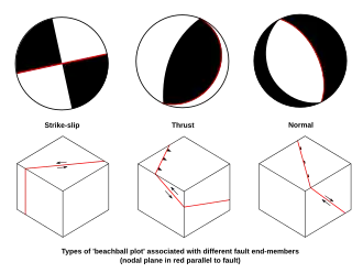 Le calcul d'un mécanisme au foyer se fait à partir des enregistrements ou sismogrammes, issus de différentes stations sismiques. Ce calcul peut se faire à partir de méthodes automatiques et de modélisation des formes d'ondes[2],[3]. Le mécanisme au foyer est dérivé du tenseur des moments du séisme, qui permet aussi de calculer l'amplitude du mouvement, l'énergie délivrée par le séisme, et donc la magnitude de moment.