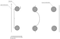 La dislocation, en s'allongeant, produit un demi-cercle entre les particules, dont le rayon R est le suivant (avec r le rayon des particules et l la distance séparant le centre de chaque particule) :