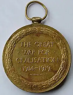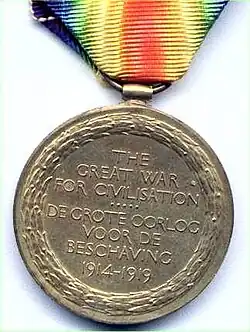 - ↑ Texte bilingue sur le revers : « « THE GREAT WAR FOR CIVILISATION / DE GROOTE OORLOG TOT DE BESCHAVING ».