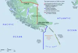 - L'Argentine étend ses revendications à tous les territoires au sud de la Terre de Feu et à l'est du méridien traversant le cap Horn. C'est-à-dire que l'Argentine revendiquait l'île Horn, les îles Wollaston, l'île Deceit, l'île Barnevelt, les îles Evout, l'île Herschel, etc.