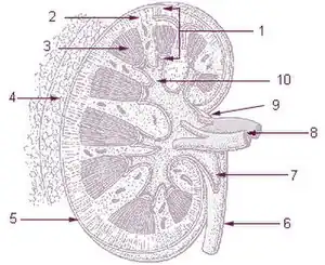 La médullaire rénale est divisée en plusieurs sections, appelées les pyramides rénales. Le sang pénètre dans le rein par l’artère rénale, qui se sépare pour former les artères interlobaires. Les artères interlobaires se ramifient en artères arquées, qui à leur tour se ramifient pour former des artères interlobulaires et celles-ci atteignent finalement les glomérules. Au niveau du glomérule, le sang atteint un gradient de pression très défavorable et une grande surface d’échange, ce qui force la partie sérique du sang à sortir du vaisseau et à pénétrer dans les tubules rénaux. L'écoulement se poursuit à travers les tubules rénaux, y compris le tube proximal, l'anse de Henle, à travers le tube distal et quitte finalement le rein par le canal collecteur menant au bassinet rénal, la partie dilatée de l'uretère.