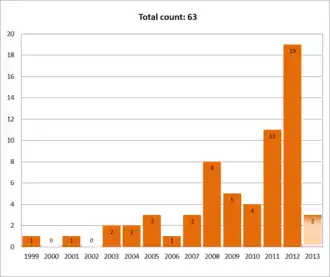 Le nombre de méga-premiers trouvés par année.