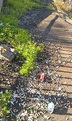 - L'interdiction de fumer dans l'espace public intérieur ou dans les aires de jeux pour enfant ont fait que les fumeurs sont plus nombreux à fumer dehors, où ils refuseraient ou négligeraient de faire quelques pas vers le cendrier le plus proche ou d'utiliser un cendrier portatif[33] (hypothèse périodiquement évoquée mais qui reste non testée)[34]. Selon l'ONG Keep Britain Tidy, après l'interdiction de fumer dans les espaces publics intérieurs (en 2007) le nombre de mégots trouvés dehors a augmenté de 43 % dans le pays[6]. Dans certains contextes (centre-ville...), le nombre de cendriers présents est l'un des facteurs contextuels prédicteurs du nombre de mégots jetés au sol[35].
