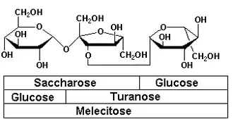 Le mélézitose est composé de deux unités de glucose et d'une unité fructose, une unité de glucose étant attachée à une unité de turanose par son fructose par une liaison osidique du type α(1-2) (par le glucose dans le cas du gentianose) ou à une unité de saccharose par son fructose par une liaison osidique α(1-3).