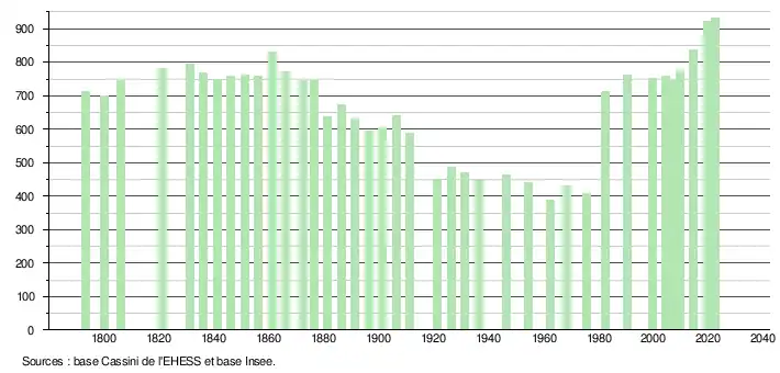 L'évolution du nombre d'habitants est connue à travers les recensements de la population effectués dans la commune depuis 1793. Pour les communes de moins de 10 000 habitants, une enquête de recensement portant sur toute la population est réalisée tous les cinq ans, les populations de référence des années intermédiaires étant quant à elles estimées par interpolation ou extrapolation[20]. Pour la commune, le premier recensement exhaustif entrant dans le cadre du nouveau dispositif a été réalisé en 2004[21].