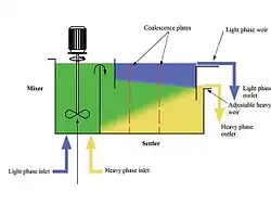 Une chambre de mélange contient un agitateur mécanique qui apporte un contact intime à la solution d'alimentation et au solvant d'extraction pour effectuer le transfert du ou des solutés. L'agitateur mécanique est équipé d'un moteur qui entraîne une turbine de mélange et de pompage. Cette turbine amène les deux phases, les mélange et transfère l'émulsion formée au décanteur. Le mélangeur peut comporter un ou plusieurs étages de réservoirs de mélange. Les mélangeurs de laboratoire communs se composent d'un seul étage de mélange alors que les mélangeurs industriels peuvent comporter jusqu'à trois étages de mélange où chaque étage effectue une action combinée de pompage et de mélange. L'utilisation de plusieurs étages permet un temps d'interaction plus long[1].