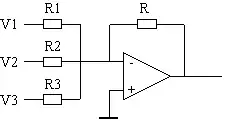 Dans ce montage inverseur, le quotient de la tension d'entrée Vn par la résistance Rn détermine le courant qui vient de l'entrée n s'ajouter à celui des autres entrées et va traverser la résistance R et donner le signal de sortie :