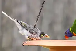 Une étude sur le comportement alimentaire de l'espèce dans les jardins urbains a montré que le méliphage bruyant passe plus de temps dans les banksia, les grevilleas, les espèces d'eucalyptus et dans les callistemons lorsqu'ils ont en fleurs que dans les autres plantes dont celles exotiques. L'essentiel du temps est consacré à la recherche de nourriture dans le feuillage des eucalyptus et la densité de population est très supérieure dans les zones où les eucalyptus sont abondants. Le méliphage bruyant peut satisfaire la plus grande partie de ses besoins grâce à la sève et au miellat obtenus dans le feuillage des eucalyptus[24]. Dans les zones abondantes en banksias et grevillas, le méliphage bruyant est moins présent que d'autres grands méliphages comme le méliphage à gouttelettes (Anthochaera chrysoptera) et le méliphage barbe-rouge (Anthochaera carunculata)[25].