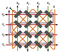 Afin de réduire le nombre de fils et d'amplificateurs pour l'écriture et la lecture, ainsi que le besoin en place, pour toute application pratique, les tores sont arrangés en forme de matrice. Chaque tore est traversé par deux fils, X et Y, pour l'adressage. Un fil de chaque dimension est alimenté à la fois. Lors de l'écriture, seul le courant dans le tore au croisement des deux fils sera suffisant pour induire un champ suffisant pour changer son état de magnétisation. Dans les autres tores passe seulement la moitié du courant nécessaire, voire aucun.