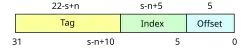 De plus, une ligne a une taille de 256 bits soit 32 octets. La mémoire étant adressable par octet, cela implique un offset de 5 bits. L'offset est le décalage à l'intérieur d'une ligne pour accéder à un octet particulier. Ces calculs donnent le découpage de l'adresse suivant pour une mémoire cache mappée directement :