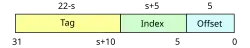 L'adresse de 32 bits permet d'accéder à une mémoire de 232 octets, soit 235 bits. L'index étant de s+5 bits, il faut distinguer 222-s éléments de la mémoire principale par ligne de cache. Le tag est donc de 22-s bits.