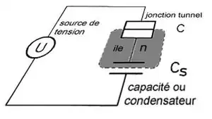 Le circuit élémentaire, appelé "boîte à électrons", permettant de contrôler leur passage est représenté sur la figure 1. Ce circuit se compose d'une jonction tunnel reliée à une capacité Cs