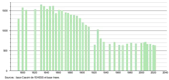 L'évolution du nombre d'habitants est connue à travers les recensements de la population effectués dans la commune depuis 1793. Pour les communes de moins de 10 000 habitants, une enquête de recensement portant sur toute la population est réalisée tous les cinq ans, les populations de référence des années intermédiaires étant quant à elles estimées par interpolation ou extrapolation[22]. Pour la commune, le premier recensement exhaustif entrant dans le cadre du nouveau dispositif a été réalisé en 2004[23].