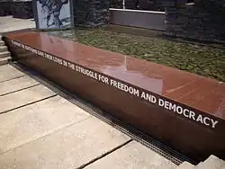 À l'entrée de l'esplanade se dresse une photo d'Hector Pieterson porté par Mbuyisa Makhubo, photo devenue emblématique de la lutte anti-apartheid.