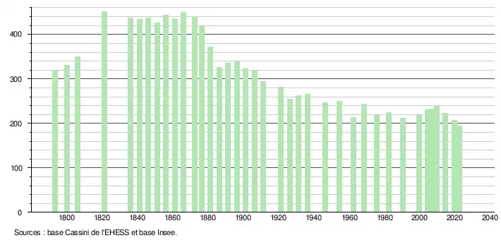 L'évolution du nombre d'habitants est connue à travers les recensements de la population effectués dans la commune depuis 1793. Pour les communes de moins de 10 000 habitants, une enquête de recensement portant sur toute la population est réalisée tous les cinq ans, les populations de référence des années intermédiaires étant quant à elles estimées par interpolation ou extrapolation[25]. Pour la commune, le premier recensement exhaustif entrant dans le cadre du nouveau dispositif a été réalisé en 2004[26].