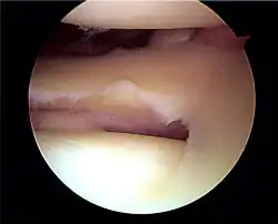 Le ménisque présente un hypersignal sur les pondérations T2 ou DP en IRM. A l'arthrographie, le ménisque, terne, semble avoir perdu sa souplesse.