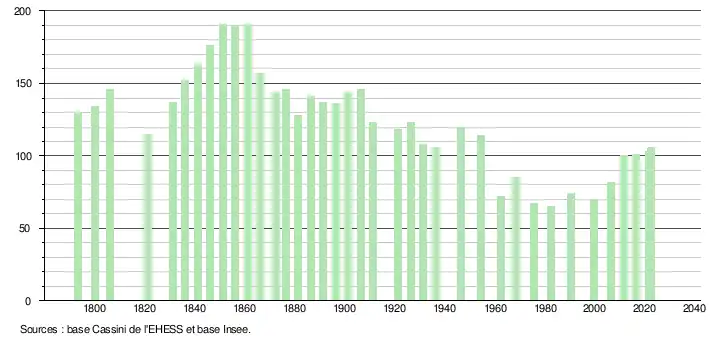 L'évolution du nombre d'habitants est connue à travers les recensements de la population effectués dans la commune depuis 1793. Pour les communes de moins de 10 000 habitants, une enquête de recensement portant sur toute la population est réalisée tous les cinq ans, les populations de référence des années intermédiaires étant quant à elles estimées par interpolation ou extrapolation[23]. Pour la commune, le premier recensement exhaustif entrant dans le cadre du nouveau dispositif a été réalisé en 2006[24].