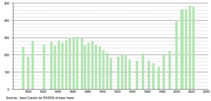 L'évolution du nombre d'habitants est connue à travers les recensements de la population effectués dans la commune depuis 1793. Pour les communes de moins de 10 000 habitants, une enquête de recensement portant sur toute la population est réalisée tous les cinq ans, les populations de référence des années intermédiaires étant quant à elles estimées par interpolation ou extrapolation[26]. Pour la commune, le premier recensement exhaustif entrant dans le cadre du nouveau dispositif a été réalisé en 2007[27].