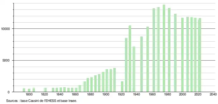 - ↑ Par convention dans Wikipédia, le principe a été retenu de n’afficher dans le tableau des recensements et le graphique, pour les populations de référence postérieures à 1999, que les populations correspondant à une enquête exhaustive de recensement pour les communes de moins de 10 000 habitants, et que les populations des années 2006, 2011, 2016, etc. pour les communes de plus de 10 000 habitants, ainsi que la dernière population de référence publiée par l’Insee pour l'ensemble des communes.