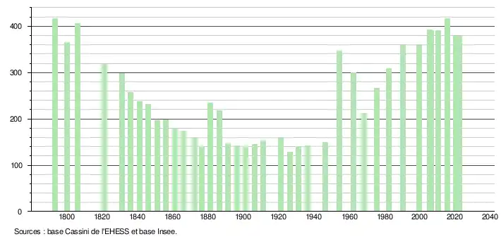 L'évolution du nombre d'habitants est connue à travers les recensements de la population effectués dans la commune depuis 1793. Pour les communes de moins de 10 000 habitants, une enquête de recensement portant sur toute la population est réalisée tous les cinq ans, les populations de référence des années intermédiaires étant quant à elles estimées par interpolation ou extrapolation[23]. Pour la commune, le premier recensement exhaustif entrant dans le cadre du nouveau dispositif a été réalisé en 2005[24].