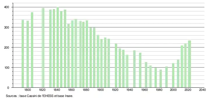 L'évolution du nombre d'habitants est connue à travers les recensements de la population effectués dans la commune depuis 1793. Pour les communes de moins de 10 000 habitants, une enquête de recensement portant sur toute la population est réalisée tous les cinq ans, les populations de référence des années intermédiaires étant quant à elles estimées par interpolation ou extrapolation[15]. Pour la commune, le premier recensement exhaustif entrant dans le cadre du nouveau dispositif a été réalisé en 2006[16].