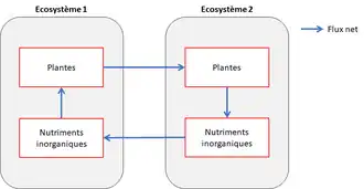 Les flux de ressources regroupent les flux de nutriments inorganiques et les flux de détritus (nécromasse et produits de l'excrétion des êtres vivants). Ils peuvent être générés par des mécanismes physiques passifs (vent, gravité, courants…) entre écosystèmes similaires ou différents, proches ou éloignés[7],[5]. Par exemple, un flux de nutriments d’origine détritique est créé lorsque la litière d’origine terrestre tombe dans une rivière où elle sera décomposée par des organismes détritivores aquatiques[7]. Des flux de ressources peuvent également être générés de façon indirecte par certains types de déplacements d’organismes. C’est le cas des migrations saisonnières (cf. exemple 1), des migrations liées au cycle de vie (cf. exemple 2), et des déplacements liés à l’acquisition de nourriture (cf. exemple 3)[5].
