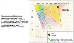 Le gabbro se transforme progressivement en métagabbro en suivant le diagramme de pression/température (P, T, t) ci-dessous :