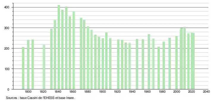 L'évolution du nombre d'habitants est connue à travers les recensements de la population effectués dans la commune depuis 1793. Pour les communes de moins de 10 000 habitants, une enquête de recensement portant sur toute la population est réalisée tous les cinq ans, les populations de référence des années intermédiaires étant quant à elles estimées par interpolation ou extrapolation[16]. Pour la commune, le premier recensement exhaustif entrant dans le cadre du nouveau dispositif a été réalisé en 2005[17].