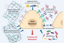 La transition épithélio-mésenchymateuse est un spectre d'étapes de transition entre les phénotypes épithéliaux et mésenchymateux[15], et elle est régie par un certain nombre de facteurs de croissance[16] et de voies de signalisation[17]. La transition épithélio-mésenchymateuse spontanée dans les cellules tumorales primaires se déplace entre différents stades intermédiaires présentant différentes caractéristiques invasives, métastatiques et de différenciation[18]. Les cellules tumorales qui expriment un mélange de phénotypes épithéliaux et mésenchymateux sont plus efficace dans la circulation, la colonisation et le développement de métastases[18]. Le séquençage transcriptionnel de la chromatine et de l'ARN unicellulaire montre des expressions géniques différentes qui sont régulées par des facteurs de transcription et des voies de signalisation communs et distincts. Les différents stades de la transition épithélio-mésenchymateuse sont situés dans divers microenvironnements et en contact avec diverses cellules stromales. Les cellules tumorales libèrent de grandes quantités de chimiokines pour attirer les cellules immunitaires et stimuler l'angiogenèse, favorisant ainsi le développement d'une niche inflammatoire unique et hautement vascularisée[18]. Les fibroblastes associés aux cancers conduisent et dirigent la migration des cellules cancéreuses via l'alignement de la fibronectine[19]. L’hypoxie[20], les facteurs de stress métaboliques et la rigidité matricielle[21] déclenchent la transition épithélio-mésenchymateuse dans les cellules cancéreuses.