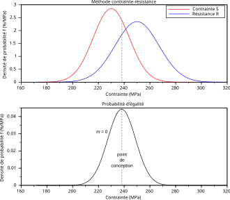 On peut tracer la surface y = ƒS׃R, ainsi que la ligne de séparation m = 0 : cette ligne marque l'état limite entre la situation de survie et la situation de défaillance. Une méthode simple d'estimer la probabilité P(m ≤ 0) consiste à utiliser une méthode de Monte-Carlo : on effectue N tirages aléatoires de couples (R, S), et l'on dénombre les n situations pour lesquelles m ≤ 0 :