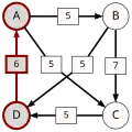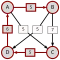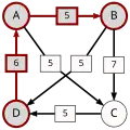 La victoire la plus serrée est celle de E sur A (une voix d’avance seulement). L’arc correspondant, qui a la pondération la plus faible (1), est enlevé. Le graphe modifié est alors le suivant :