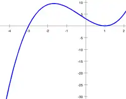3. Dans la troisième itération, on utilise une IQI entre (a2; f(a2)) = (−4; −25) et (b1; f(b1)) = (1,23256; 0,22891) et (b2; f(b2)) = (1,14205; 0,083582), ce qui donne 1,09032. Cette valeur est entre (3a2 + b2) / 4 et b2;mais la condition supplémentaire de Brent bloque: en effet, l'inégalité |1,09032 − b2| ≤ |b1b0| / 2 n'est pas vérifiée: la valeur en cours est donc rejetée. À la place, on calcule le point milieu de l'intervalle [a2; b2]: m = −1,42897. On a f(m) = 9,26891; on pose alors a3 = a2 et b3 = −1,42897;