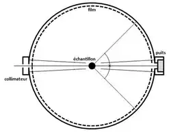 Une pellicule de film est placée sur les parois de la chambre et sert à photographier les anneaux de diffraction. Pour faciliter la lecture du cliché, la chambre est par convention, construite de façon que sa circonférence soit égale à 360 millimètres ou à 180 millimètres. De cette façon, la mesure en millimètre des distances entre les anneaux de diffraction et le centre de la pellicule peut facilement être convertie en une valeur d’angle de diffraction. Le faisceau primaire est donc recueilli dans un puits. La collecte du faisceau primaire influence la qualité du cliché puisque la précision des données dépend du contraste entre les anneaux de diffraction et le reste du film. La chambre n’étant pas isolée, il y aura diffusion des rayons X par les molécules d’air et en plus de la création d’un voile par rayonnement parasite. Il est donc important de recueillir le rayonnement primaire le plus près possible de l’échantillon[2].