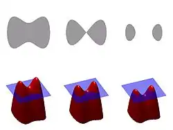 Une façon efficace bien que très simple de comprendre la méthode dans le cas d'interfaces à deux dimensions consiste à étudier l'illustration ci-contre avant de poursuivre avec une définition un peu plus technique qui sera ainsi d'accès plus facile. La figure de droite illustre plusieurs idées importantes sur la méthode. En haut à gauche nous voyons une courbe, c'est-à-dire une région bornée par une frontière régulière. Au-dessous, la surface rouge représente une fonction qui détermine cette forme, le plan bleu étant le plan (x,y). Le bord de cette forme est alors la courbe de niveau de tandis que la forme proprement dite est l'ensemble des points pour lesquels est positif ou nul.